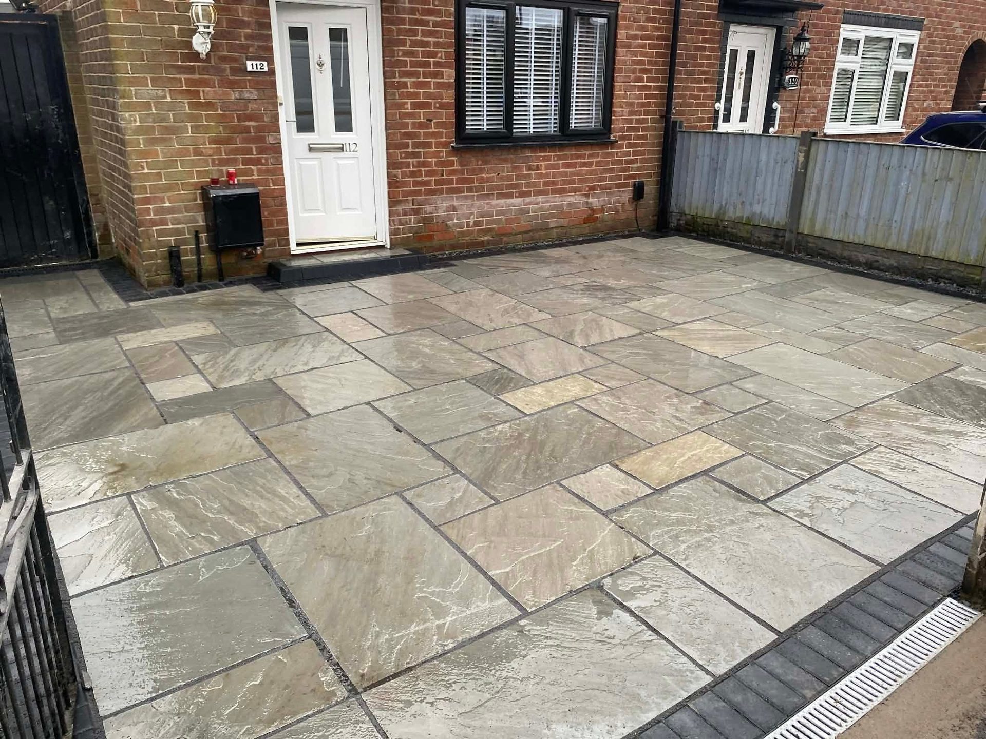 Indian stone and block paving patios with charcoal kerb borders. The perfect spot to enjoy your garden.